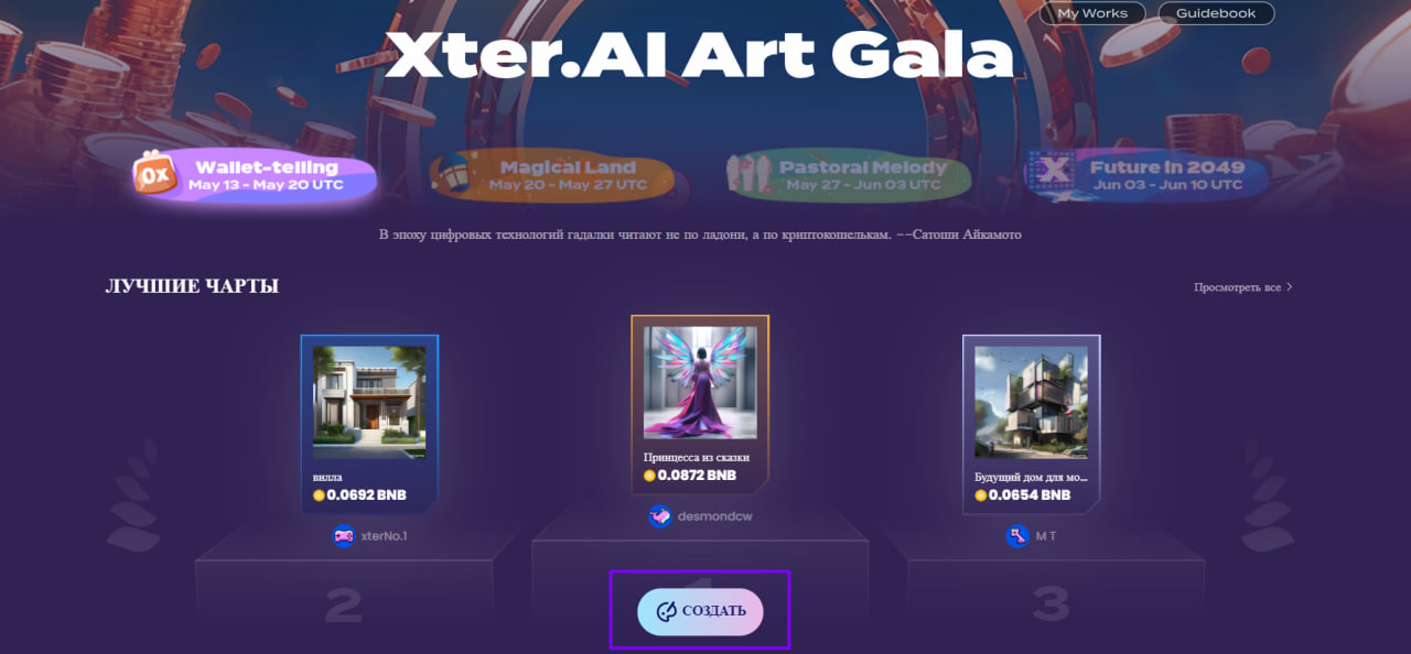 Наша задача создать изображение с помощью Xter.AI и преобразовать его в NFT. Для начала переходим к ним на сайт и коннектим кошелёк, далее находим кнопку создать и выбираем единственную доступную текущую неделю на тему "Рассказ о кошельке". Вводим всё что просит бот, генерируем nft, минтим её сами и просим друзей. Первая генерация бесплатная, последующие уже за BNB.