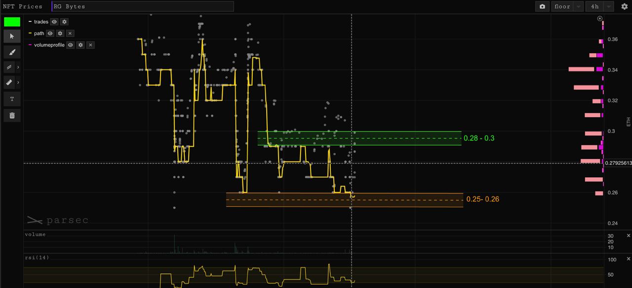 • RG Bytes - отлично подходит под флип в плюс 0.02 - 0.03 eth. Уже несколько раз отскакивали от 0.25 - 0.26 до ~ 0.3. Ждём очередную просадку и не забываем проставлять "вёдра", потому что сильный сливы тут - единственная возможность зайти в позицию.