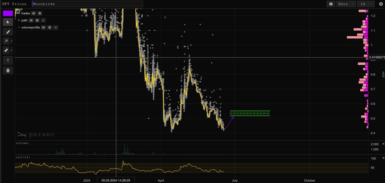 • Moonbirds - снова пришли к самому дну. В последний раз торговарились на этих значениям в середине апреля, после чего показали х2. Максимальный бид на данный момент 0.42 - либо испытываем удачу, либо сразу ставим 0.43 и выставляемся в минимальный профит. Тут будем действовать как сраткосрочно, так и среднесрочно до ~ 0.54. В подобных ситуациях не стоит исключать вариант того, что коллекция сможет обновить лои, поэтому всегда оставляем средства для DCA
