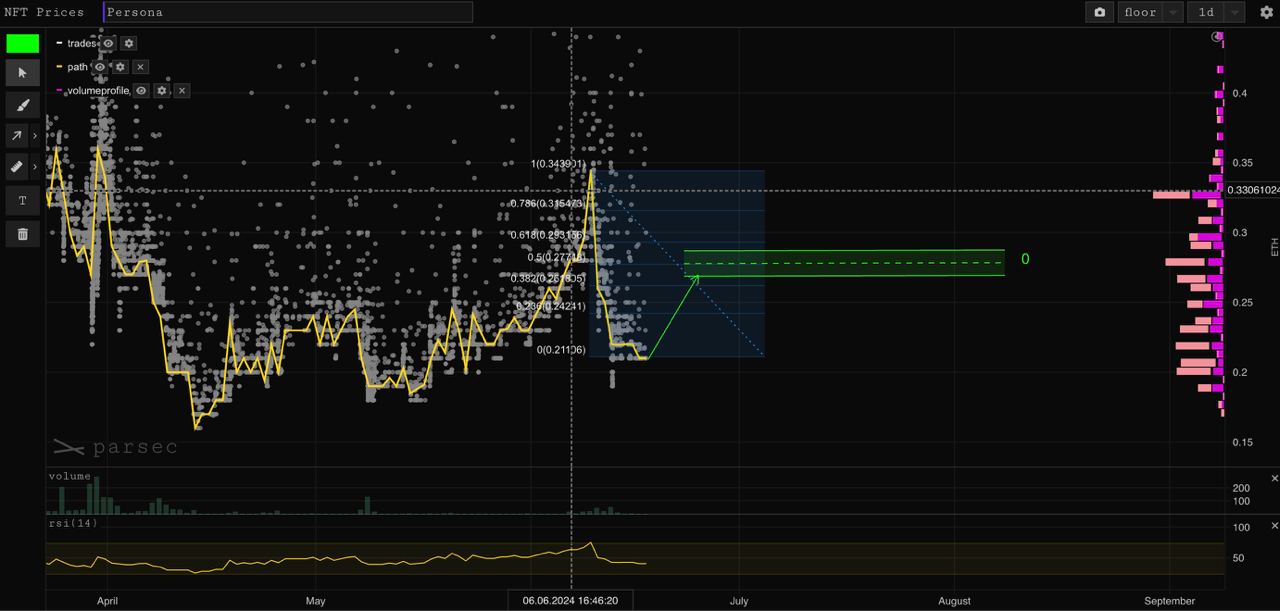 • Persona - более рисковая позиция по сравнению с остальными. После раздачи токена коллекция упала с 0.33 до 0.21 и ещё не отскакивала. Мы ждём такого расклада событий - скрин. На общем фоне рынка коллекция выглядит уверенно и одна из немногих показывает нормальные движения + холдеры сейчас ждут объявления о стейкинге. Но как всегда DIOR
