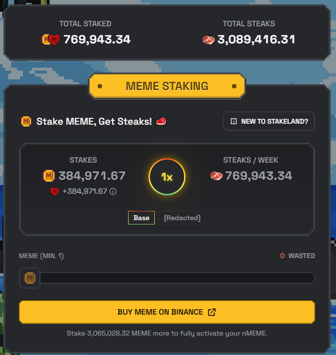 Все это время откупали падение + клеймили токены и отправляли в StakeLand, получилось скопить - 384,971 $MEME и 3,088,828 Steaks