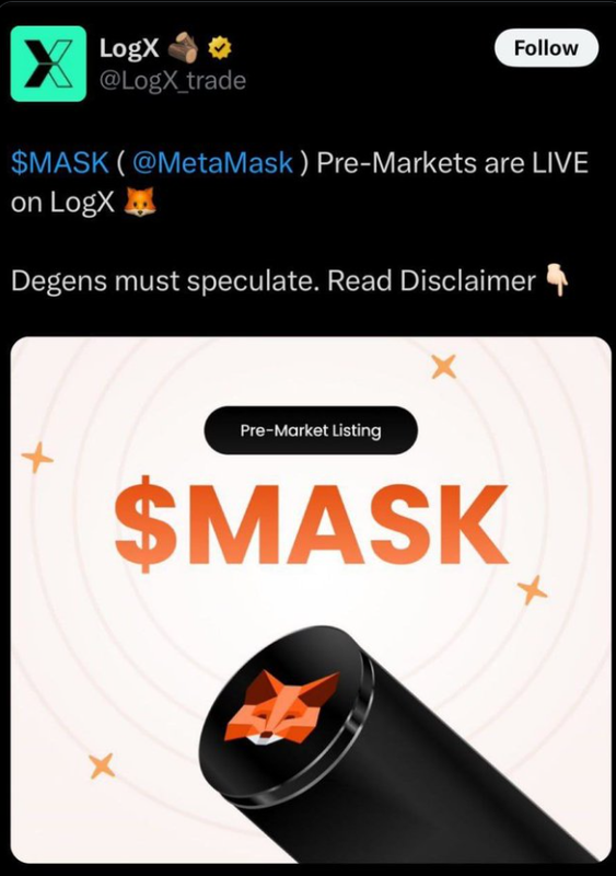 Биржа LogX на выходных выкладывает пост о том, что открываются торги на Pre-market токена $MASK, вот тот самый скрин поста, который уже удален - ссылка