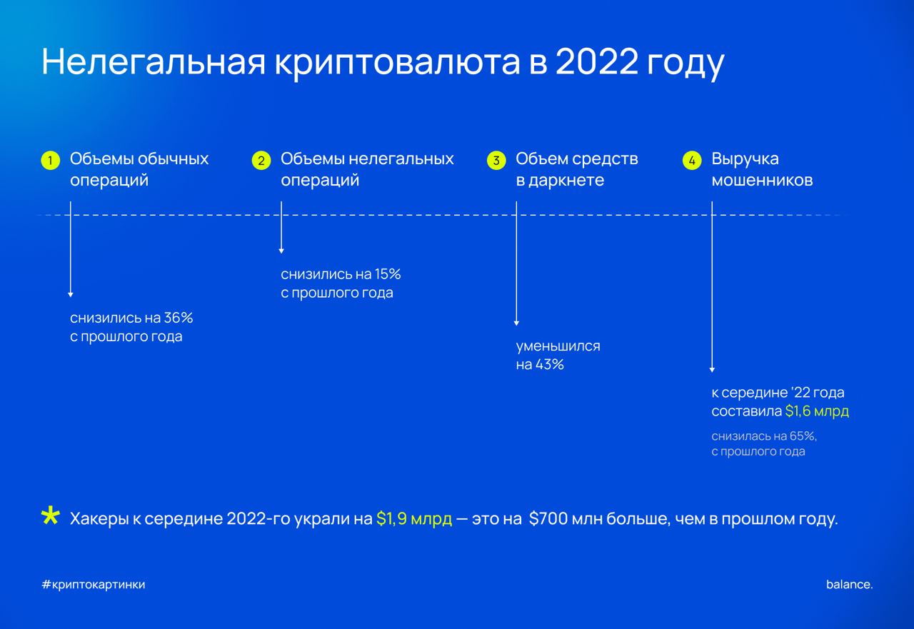 В этом году нелегальные деньги показали неоднородные результаты но в общем оказались устойчивее обычной торговли на блокчейне: когда объемы второй снизились на 36% из-за криптозимы и общей финансовой турбулентности, объем криминальных транзакций упал лишь на 15%.