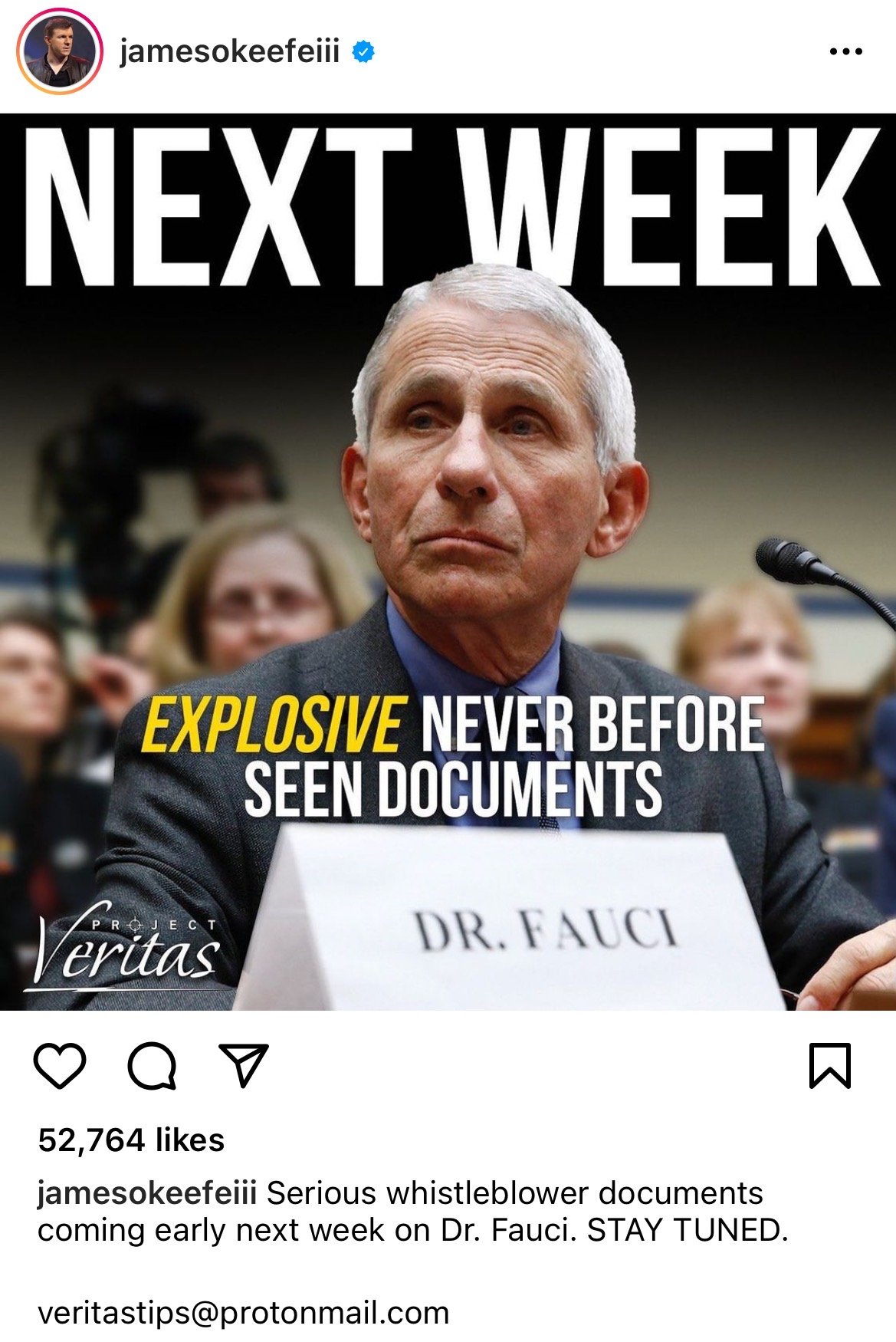 “Serious whistleblower documents coming early next week on Dr. Fauci. STAY TUNED” O’Keefe announced on his Instagram account.