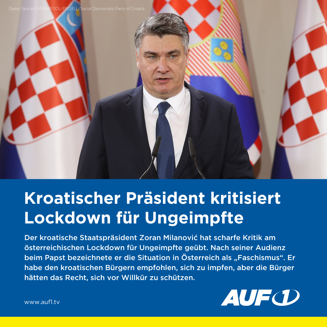 Der Lockdown für Ungeimpfte in Österreich wird im Ausland heftig kritisiert. Besonders scharfe Worte findet der kroatische Präsident Zoran Milanović nach seiner Audienz beim Papst: „Das ist schrecklich in Österreich. Das ist ein europäisches Problem. Wie sie sich mit Orbáns Verrücktheiten rund um die Menschenrechte befasst haben. Wo sind diese Brüsseler Bürokraten jetzt? Den Menschen verbieten auf die Straße zu gehen, das ist Faschismus.“