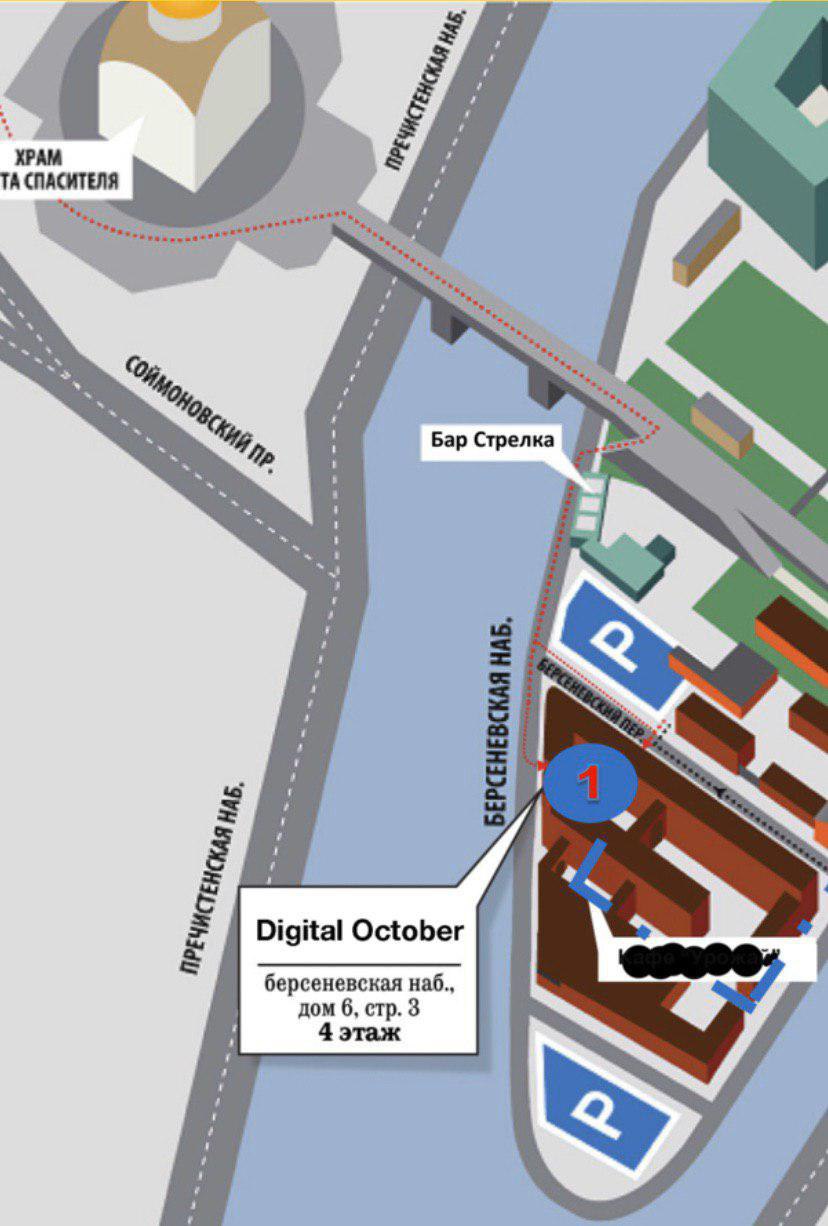 📍На всякий ещё раз схема проезда: Digital October – Берсеневская Набережная, 6 ст. 3. На схеме цифрой 1 обозначен нужный двор (после моста по Берсеневской набережной, потом свернуть к Берсеневскому переулку и напротив Cofix в арку). В этом дворе будет стеклянная дверь с указателем FrontendConf рядом и надписью Deworkacy сверху. Это нужная дверь! 4 этаж.