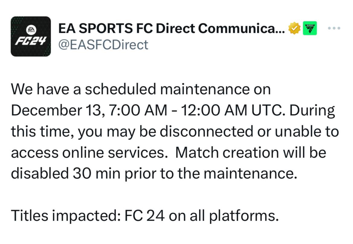 В течение этого времени не будут работать онлайн-сервисы FC 24