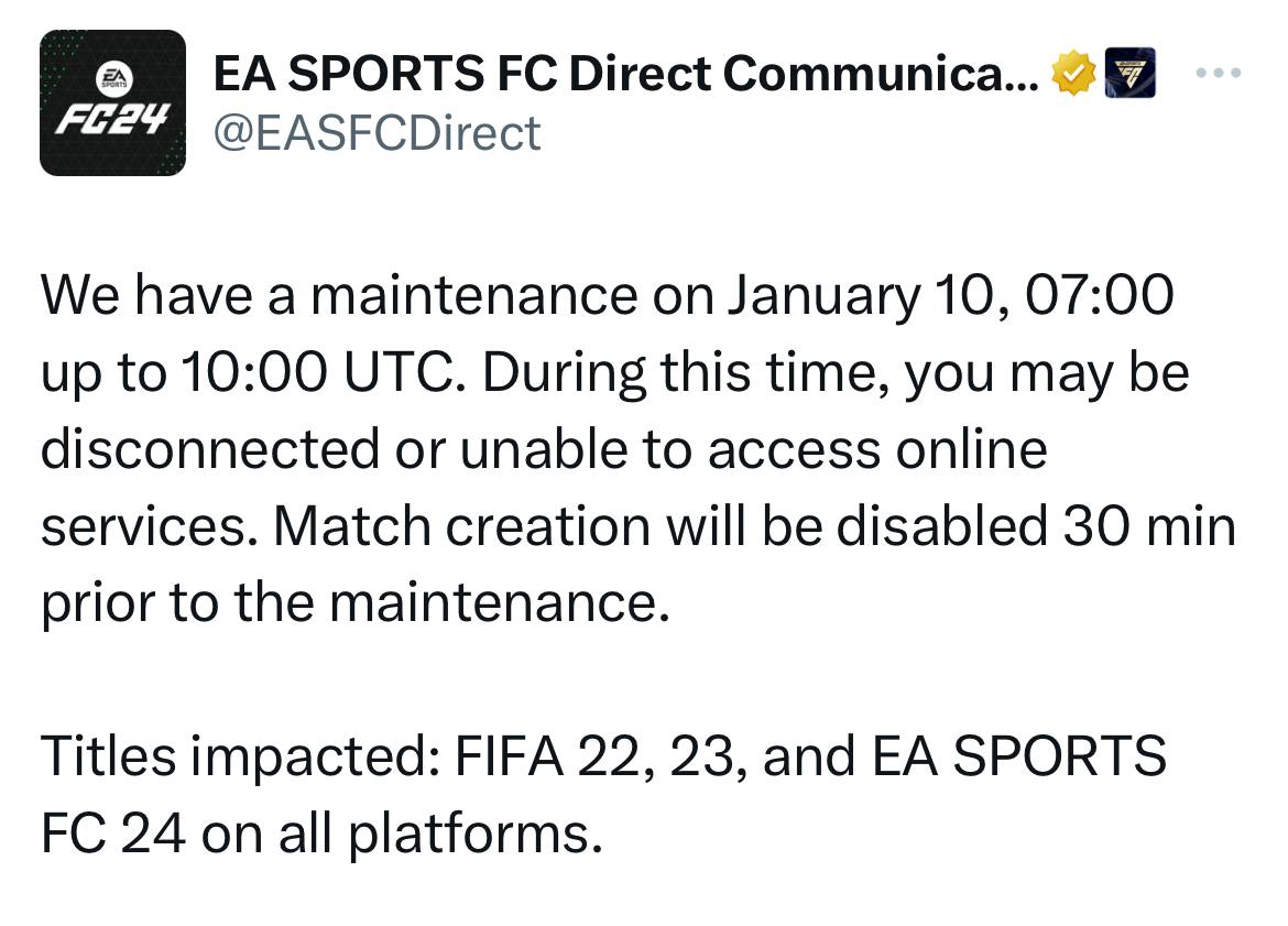 Сегодня с 10:00 до 13:00 МСК на всех платформах в FIFA 22, 23 и FC 24 будут проводиться технические работы 🛠