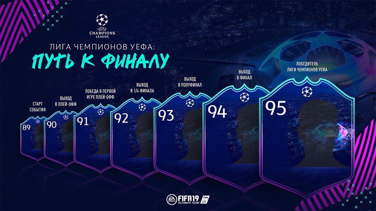 Впервые и в течение ограниченного времени в FIFA Ultimate Team 19 можно будет получить динамические предметы игроков «UEFA Champions League: путь к финалу» и «UEFA Europa League: путь к финалу». «Путь к финалу» во главу угла ставит успех команды: если команда преодолевает определенные этапы турнира, игрок получает усиление, независимо от качества его индивидуальной игры.