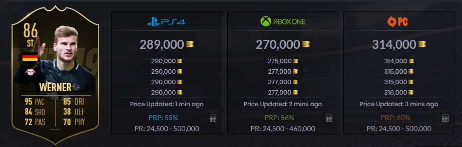 Вернеру обновили диапазон цены до 500 000 монет. Все, кто успел вчера заснайпить до 250 000 монет могут продать с серьезной прибылью, сейчас его цена примерно 290 000 монет