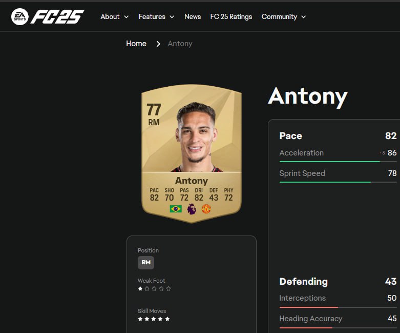 Внимание! У Антони 1 звезда на слабой ноге в FC 25.