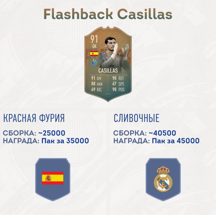 На данный момент награды в СБЧ на флешбек карту Икера Касильяса стоят дороже сборок! Выполнение двух испытаний обойдется примерно в 65 000 монет, а общая стоимость наград составляет 80 000 монет. Выходит весьма выгодно, ведь кроме паков вы получите непродаваемую карту игрока с рейтингом 91. Даже если Касильяс не нужен вашему составу — всегда пригодится в будущих СБЧ!