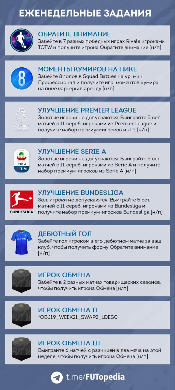 Выполняя задания во время события, вы сможете заработать уникальные награды, такие как набор с гарантированным игроком «Обратите внимание» (не для продажи), кумира версии «Лучшие моменты» в аренду на 7 матчей и тематические наборы лиг (не для продажи).