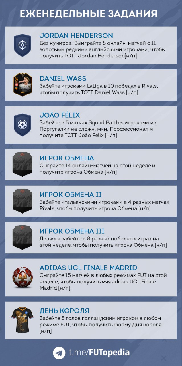 Новые еженедельные задания, в том числе награды в виде лучших игроков плей-офф еврокубков: Джордан Хендерсон, Жоау Феликс и Даниэль Васс