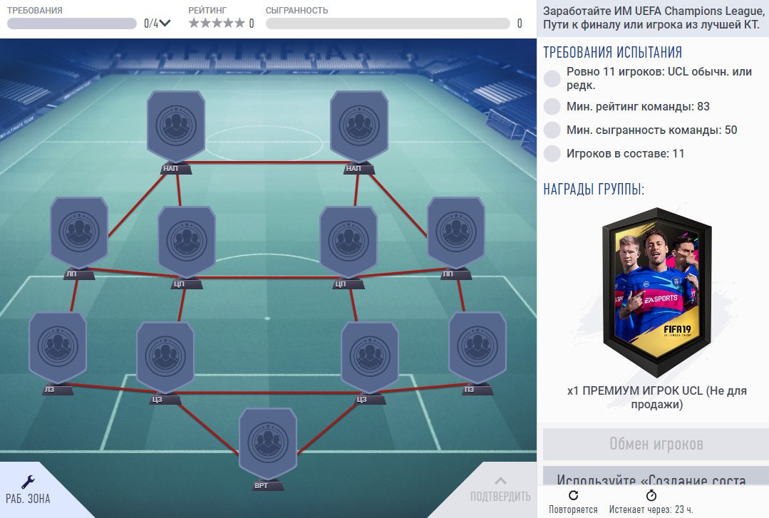 ​​В игре появилась группа испытаний «Центральные матчи УЕФА», состоящая из 7 сборок! В награду за выполнение всей группы дают большой редкий набор игроков за 100 000 монет