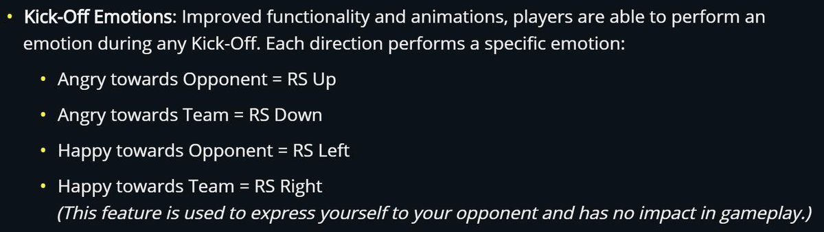 В статье о геймплее FIFA 20 сказано, что во время исполнения стандартных положений, игроки смогут управлять эмоциями футболиста правым стиком геймпада. Эта функция используется только для самовыражения и никак не влияет на игровой процесс.
