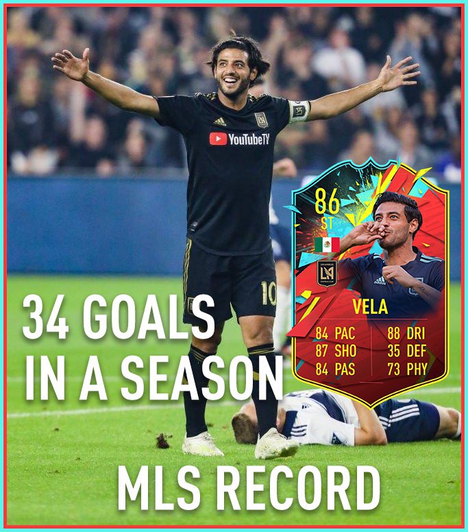 Возможная карта «Record Breaker» Карлоса Велы, побившего рекорд MLS по количеству голов за сезон. В матче против «Колорадо Рэпидз» мексиканец оформил хет-трик, таким образом, в активе Велы теперь 34 гола