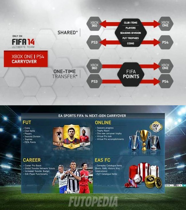 При переходе с PS3 на PS4 или с Xbox 360 на Xbox One сохранялись все карты (включая игроков), монеты, FIFA Points, трофеи и прогресс в дивизионе вашего клуба Ultimate Team. А вот перенести данные, например, с Xbox 360 на PS4 было нельзя.