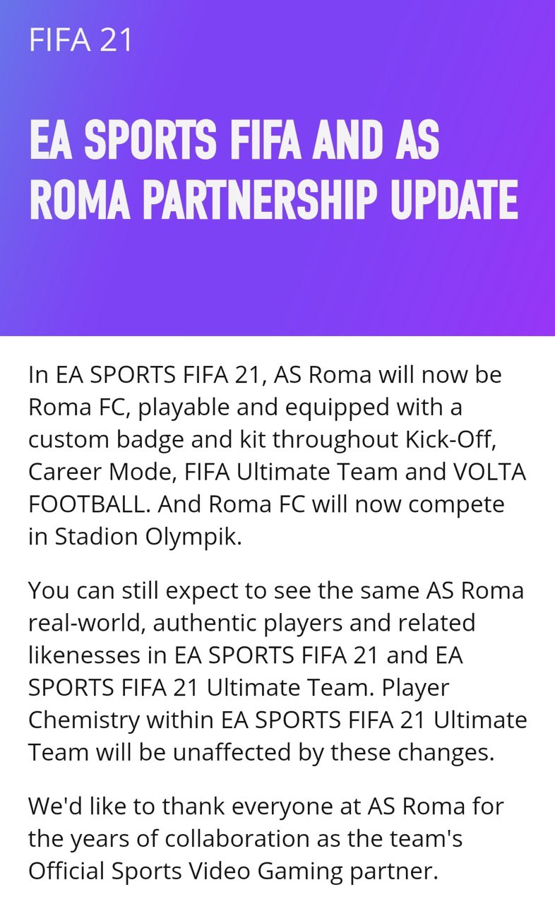 В FIFA 21 AS Roma переименуют в Roma FC, у клуба будут выдуманные эмблема, формы и стадион