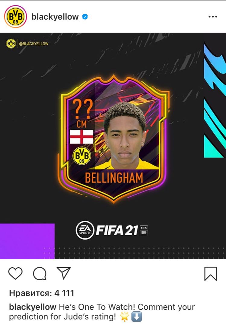 В официальном аккаунте «Боруссии Дортмунд» в инстаграм появилась карта OTW Джуда Беллингема в FUT 21