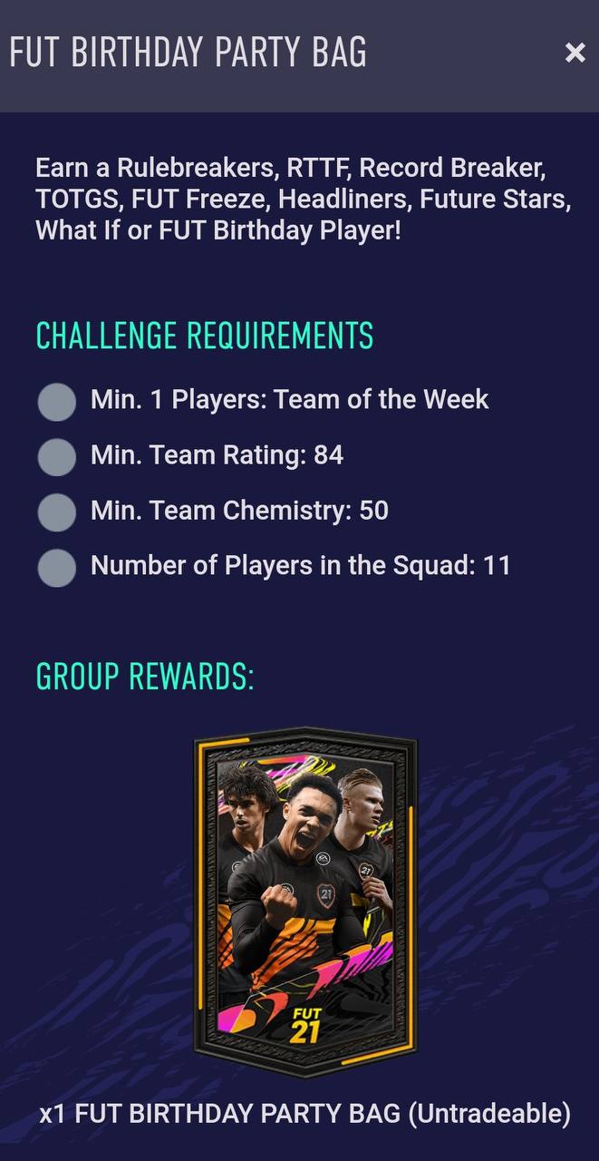 За выполнение можно получить одну карту из событий Rulebreakers, RTTF, Record Breaker, TOTGS, FUT Freeze, Headliners, Future Stars, What If или FUT Birthday