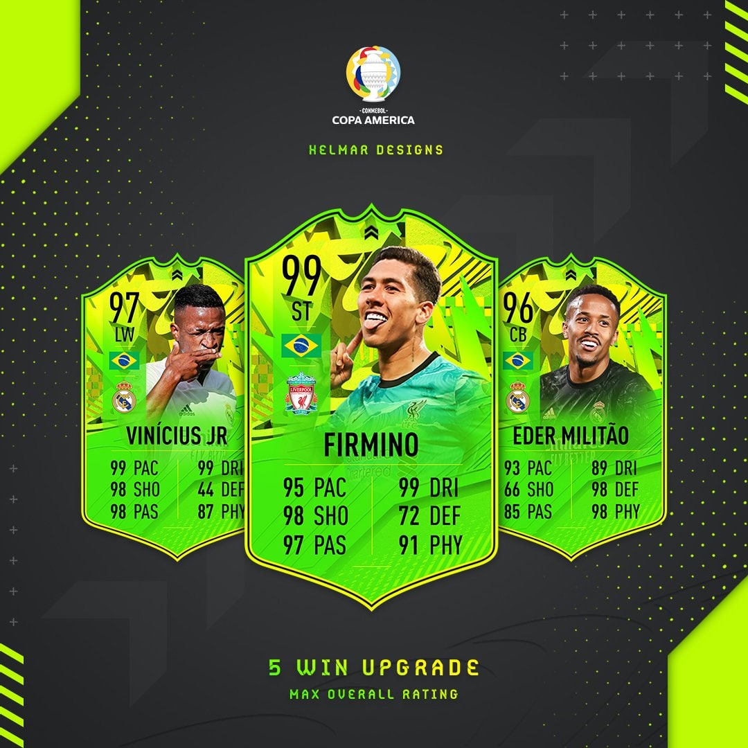 Благодаря пятой победе Бразилии карты Роберто Фирмино, Винисиуса Жуниора и Эдера Милитао обновятся до своего максимального общего рейтинга!