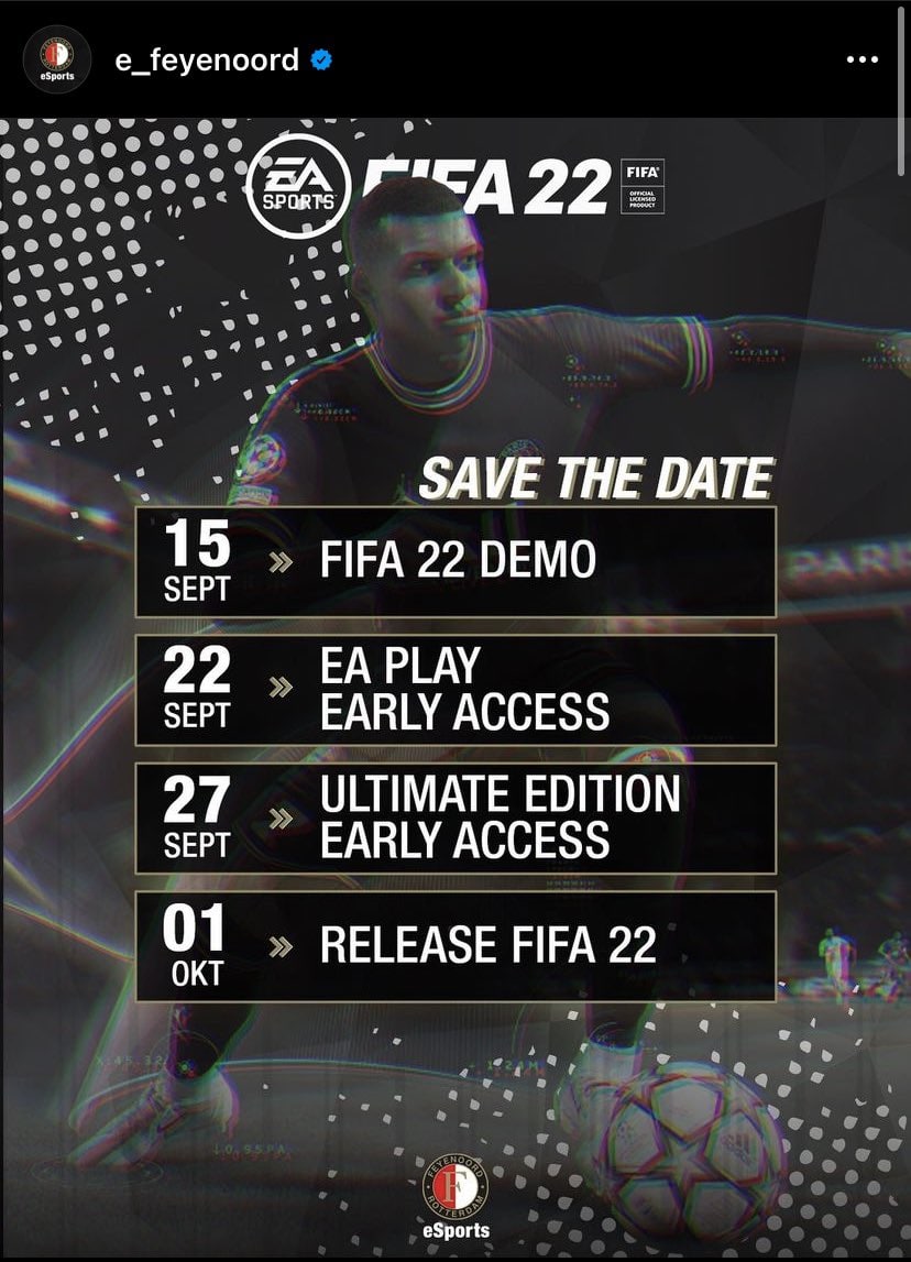 ​​В официальном инстаграме киберспортивного клуба «Фейеноорд» появилось расписание выхода FIFA 22, в котором указано, что демо-версия игры появится 15 сентября 🧐