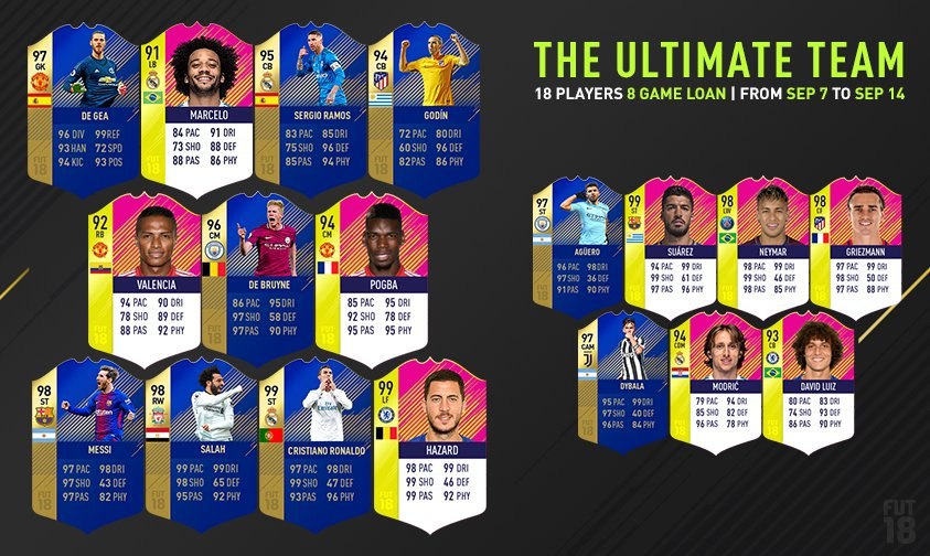 При входе в FIFA 18 Ultimate Team с 7 по 14 сентября вам выдадут набор с 18 лучшими игроками сезона в аренду на 8 матчей