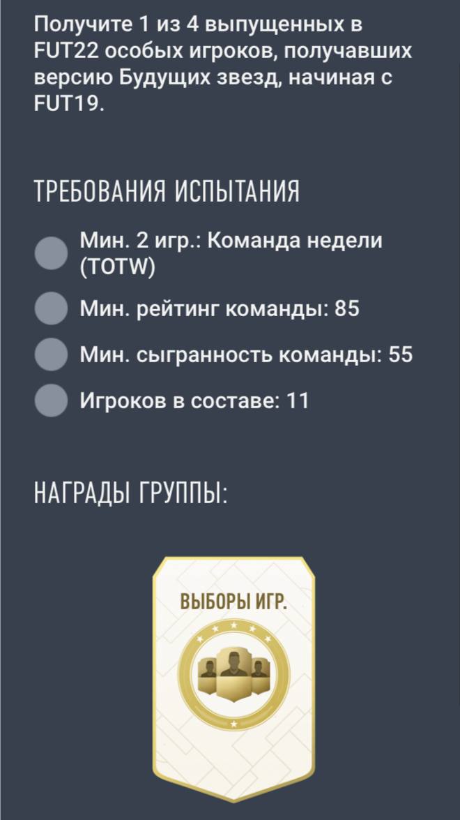 ​​В игре появилось ИПК «Выбор игрока воссоединения будущих звезд». В нем можно выбрать одного из четырех игроков со специальной картой в FUT 22, получавших карту Future Stars начиная с FUT 19.