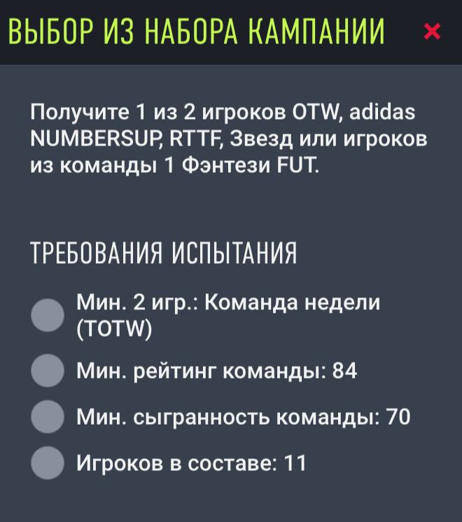 ​​Доступна сборка с выбором игрока из промо OTW, Numbersup, RTTF, Headliners или Fantasy FUT. Также появилось тематическое ИПК