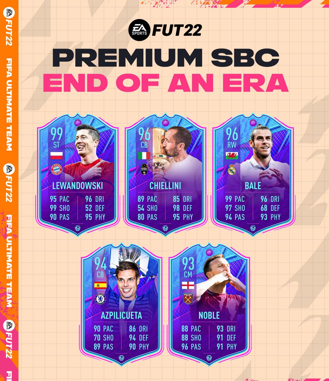 В конце текущего сезона очень много претендентов на получение карты «Конец эпохи» в FUT 22: Роберт Левандовски, Джорджо Кьеллини, Гарет Бейл, Сесар Аспиликуэта, Марк Нобл, Пауло Дибала, Марсело.