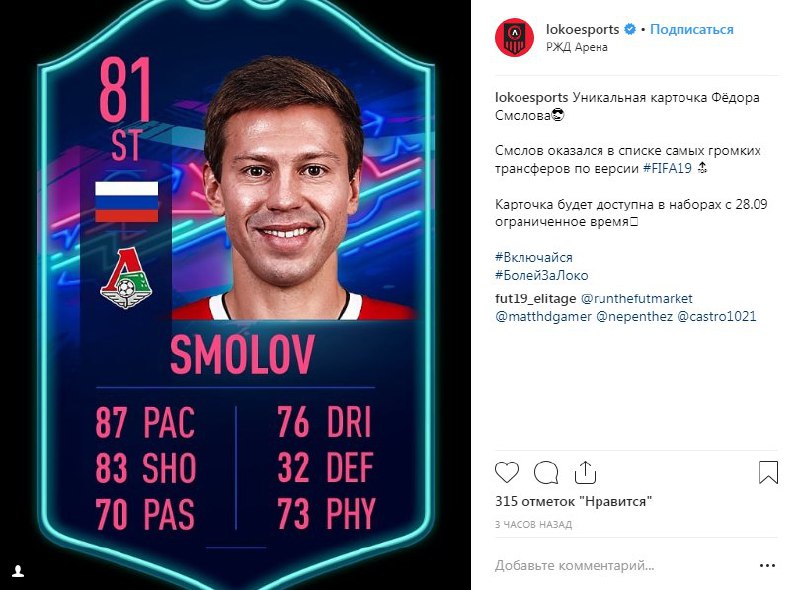 ​​Официальный инстаграм-аккаунт киберкоманды «Локомотива» опубликовал OTW-карту Федора Смолова!