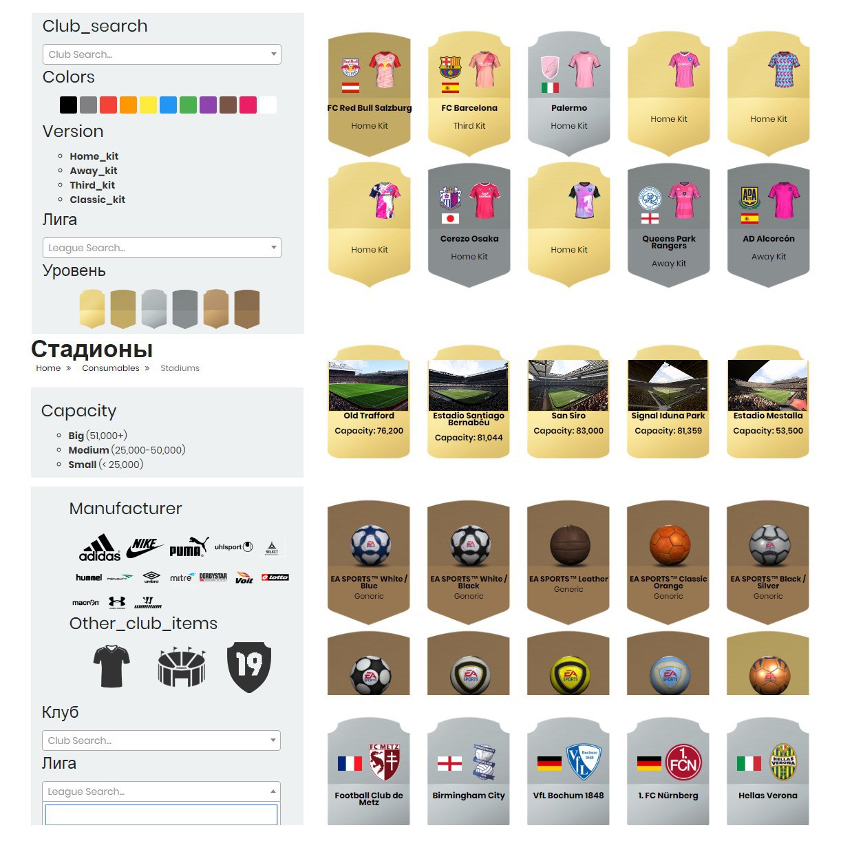 Если вы еще не определились с атрибутикой вашей команды — есть хорошие новости! На сайте Futbin появился раздел с клубными предметами FIFA 19, теперь вы сможете подобрать форму по цвету или удобно просмотреть все комплекты экипировки любой лиги, выбрать стадион по вместительности или мяч по фирме-производителю и многое другое