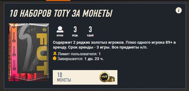 Также вышла сборка с картой TOTY в аренду на 7 матчей, тройное улучшение 85+ и группа заданий TOTY Cup