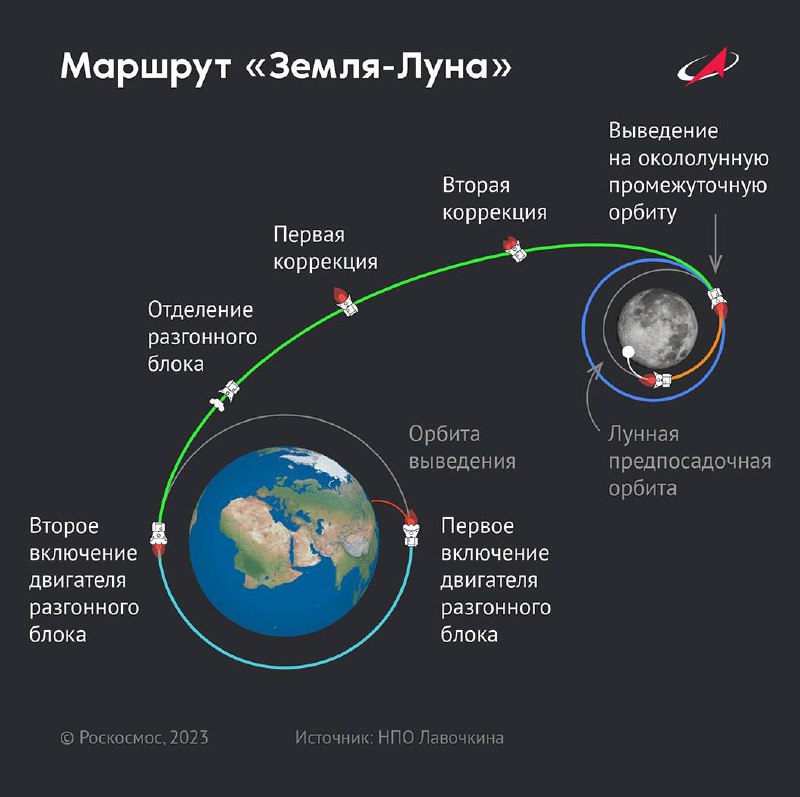 Через 9 минут после старта ракета-носитель «Союз 2.1б» выведет на земную орбиту «Луну-25» с разгонным блоком «Фрегат». Первым включением «Фрегат» подобно тягачу переместит станцию на высоту 200 км и «раскрутит» вокруг Земли на пол-оборота. Затем – второе включение двигателя плавно разгонит и «вытолкнет» станцию с круговой орбиты Земли на траекторию протяженного маршрута Земля-Луна.