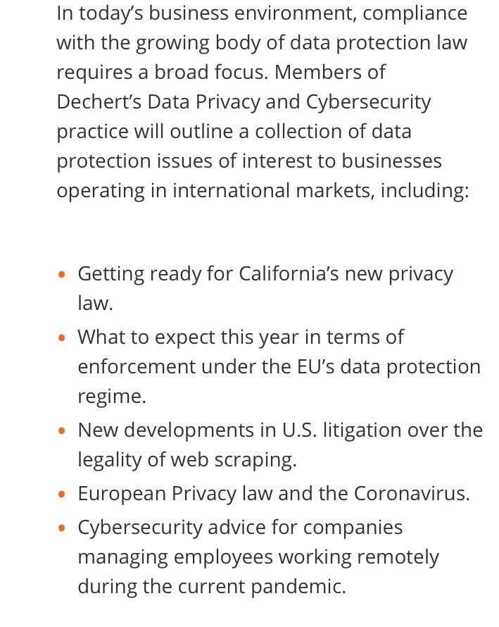 Тема: Data Privacy and Cybersecurity: Latest Developments with Big Data and Web Scraping, CCPA Compliance, GDPR Enforcements, and the “Remote Working World” of COVID-19