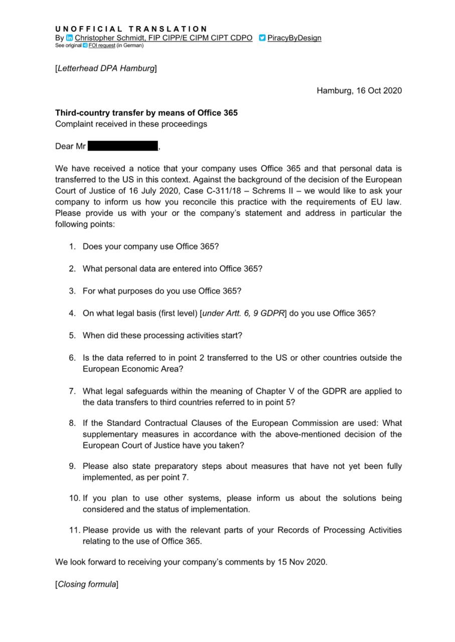 Перечень вопросов от гамбургского ркн об использовании office365 и трансграничке после Шремс 2, на немецком