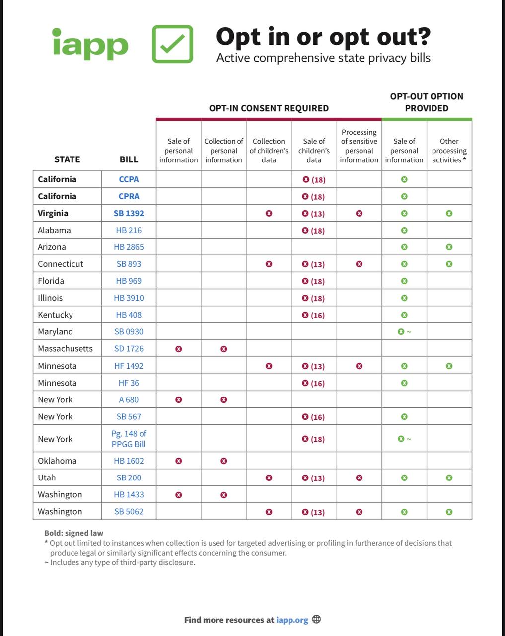 Продолжая 🇺🇸 тематику, смотри подборку биллей по штатам с требованиям opt in / opt out от IAPP