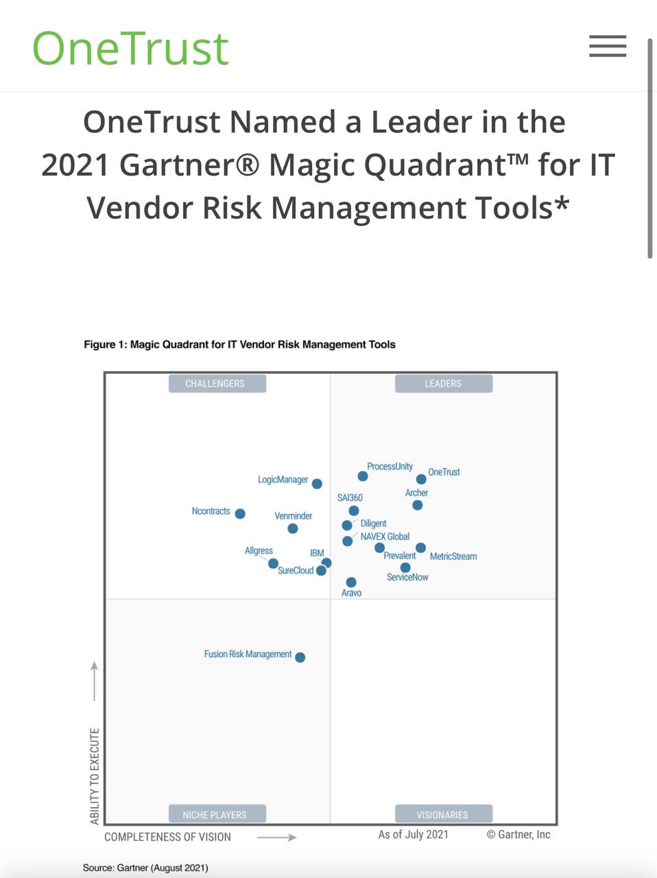 По мнению Gartner, OneTrust - лидер среди IT Vendor Risk Management Tools, скачать отчёт, заплатив ПД.