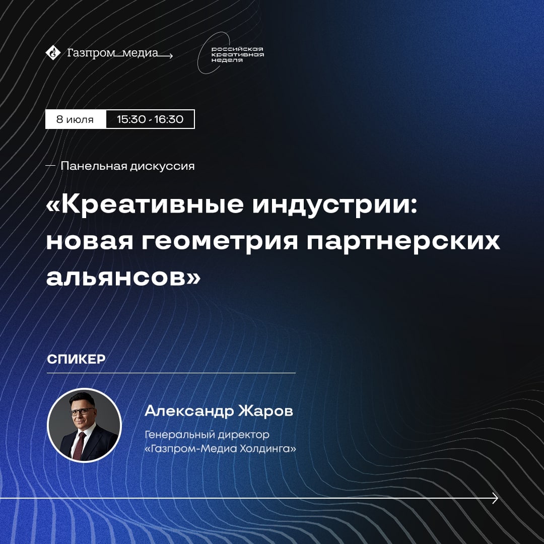 🤝 В 15:30 на Российской креативной неделе начнется панельная дискуссия «Креативные индустрии: новая геометрия партнерских альянсов», в которой участвует генеральный директор «Газпром-Медиа» Александр Жаров.