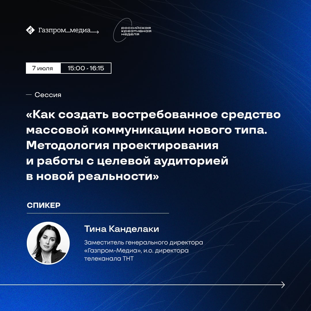 💥 Сегодня заместитель генерального директора «Газпром-Медиа», и.о. директора телеканала ТНТ Тина Канделаки принимает участие в сессии «Российской креативной недели», посвящённой СМИ нового типа.