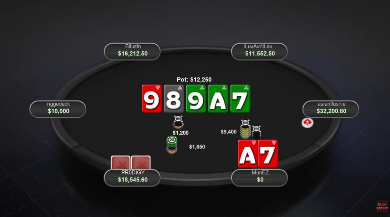 👉 На ривере вышла 7♣️, итого доска 9♥️8♠️9♣️A♣️7♣️. Мунез поставил $300 в $1,200.