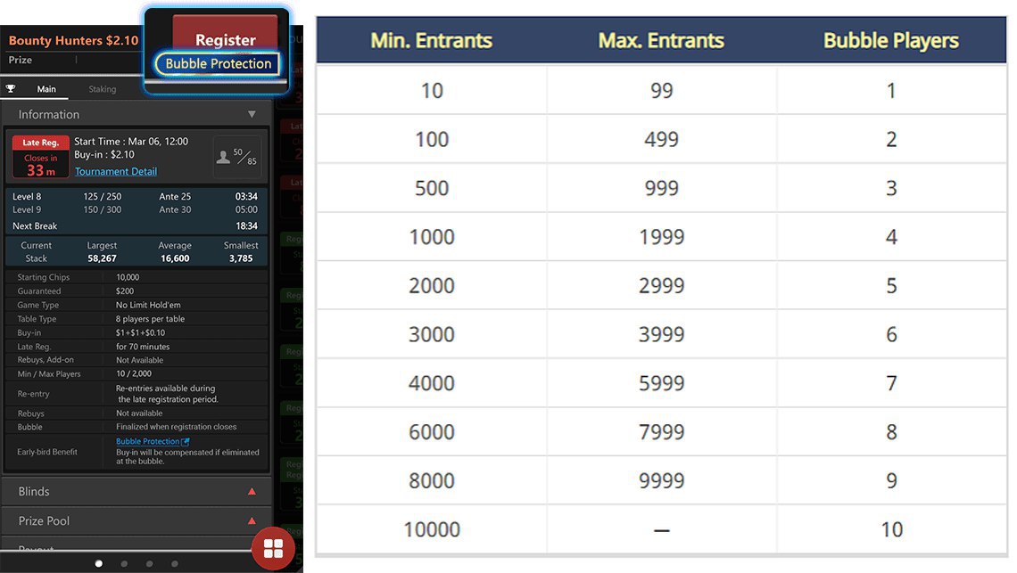 – Турниры с функцией Bubble Protection будут отмечены специальной меткой, указанной в левом углу на скриншоте.