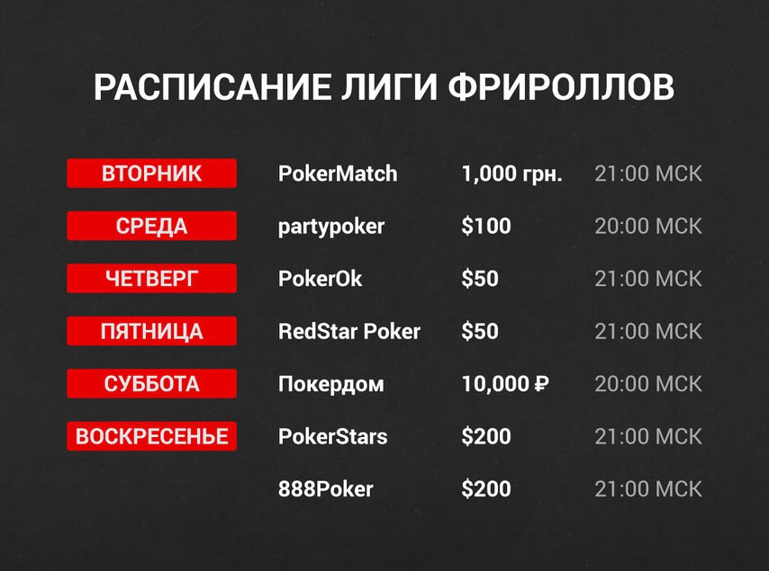 Если вы думаете, что игра во фрироллах это бессмысленная трата времени, где нужно потратить много времени ради небольшого приза, значит, вы не знакомы с фирменными фрироллами GipsyTeam. 7 турниров в неделю в семи румах, удобнее вечернее время, быстрые форматы турниров и небольшая конкуренция: в среднем в наших турнирах участвует 130 человек, а в некоторых румах в несколько раз меньше. В прошлое воскресенье на 888poker мы разыграли $100, а участников было всего 18! Учитывая уровни по 6 минут и отсутствие ребаев/адд-онов, сложно найти более простой и выгодный способ построить банкролл без вложения средств.
