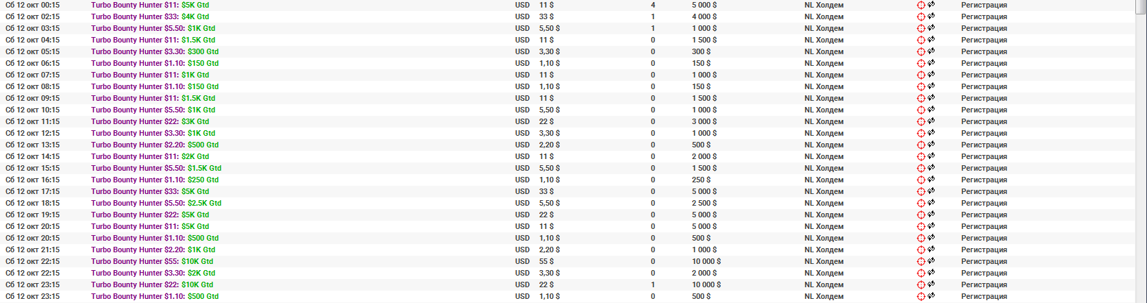 В результате турниров стало больше, а бай-ины привели к одному виду: каждый из названных турниров доступен за $1.1, $2.2, $3.3, $5.5, $11, $22 или $33. В пиковое время одновременно может начинаться несколько турниров: к примеру, в 20:15 субботы стартуют Bounty Hunter за $1.1 и $11.