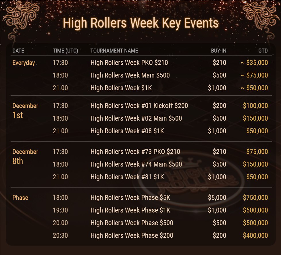 На PokerOk серия называется High Rollers Week и также пройдет с 1 по 9 декабря. В расписании 100 турниров с бай-инами от $200 до $25,000, большинство будут по холдему, но есть турниры по омахе и шортдеку. Общая гарантия составит $10,000,000.