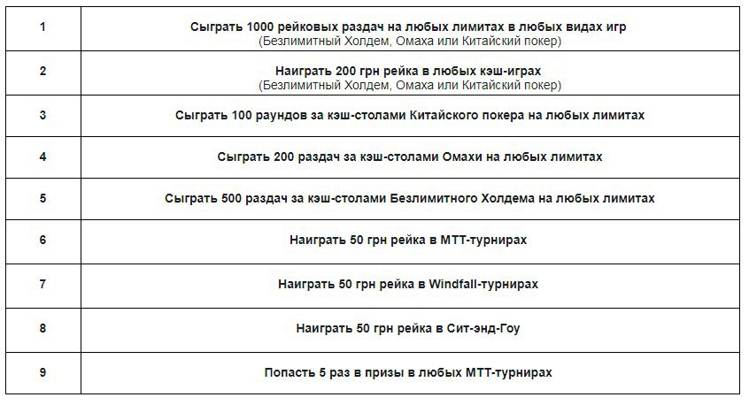 Задания несложные: сыграть 200 раздач за кэш-столами омахи или наиграть 50 гривен рейка в МТТ. Их нужно выполнить в любом порядке с 18:00 воскресенья до 17:59 следующего воскресенья по московскому времени.