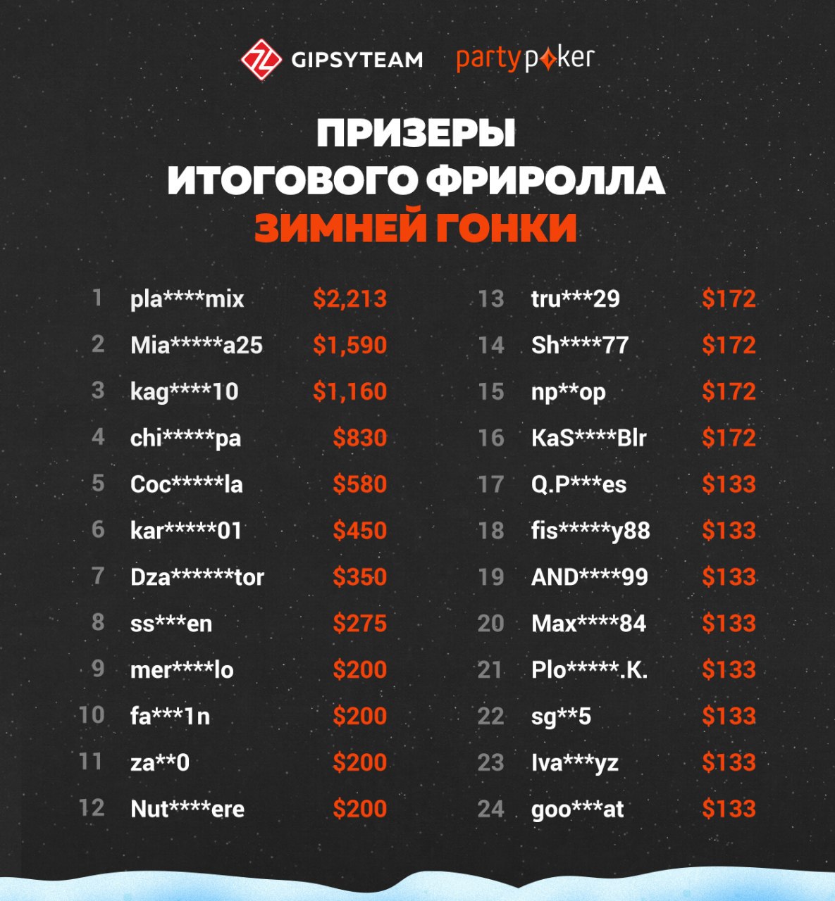 А на partypoker закончился итоговый фриролл Зимней гонки — занявшие последние призовые места получили по $133, а победитель — $2,213.