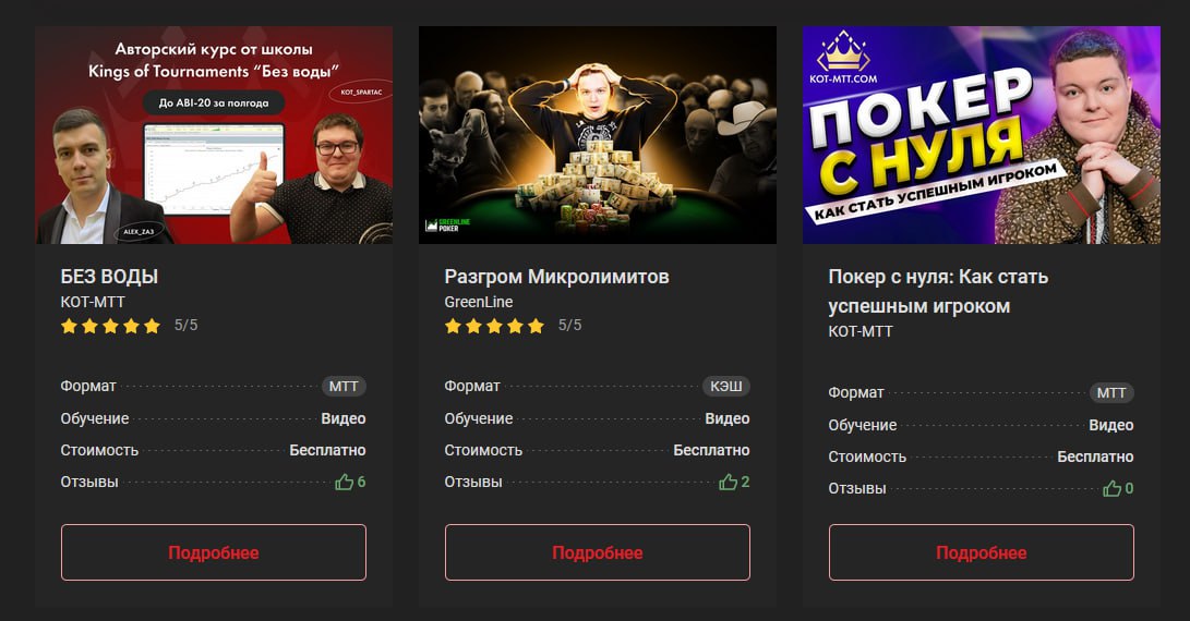 🥷 Pro-курс Глеба Тремзина. Уроки от лучших тренеров MVP, рассчитанные на игроков вплоть до ABI $100. Курс платный ($699), но покрывает ряд уникальных тем — в том числе особенности игры в турнирах с прогрессивными нокаутами.