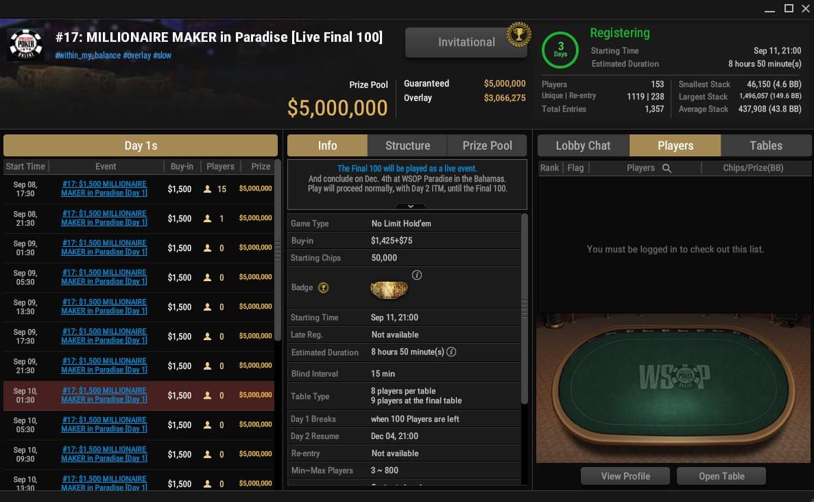 🔥 WSOP Online на экваторе. Половина серии позади, вчера на GG игроки боролись за 14-й браслет из 33. А уже в понедельник пройдет финальная стадия одного из крупнейших турниров серии, $1,500 MILLIONAIRE MAKER in Paradise с гарантией в $5,000,000. Игра будет идти до топ-100, а продолжат битву счастливчики уже на Багамах в декабре. Флайты идут каждый день, сателлиты начинаются от $8.